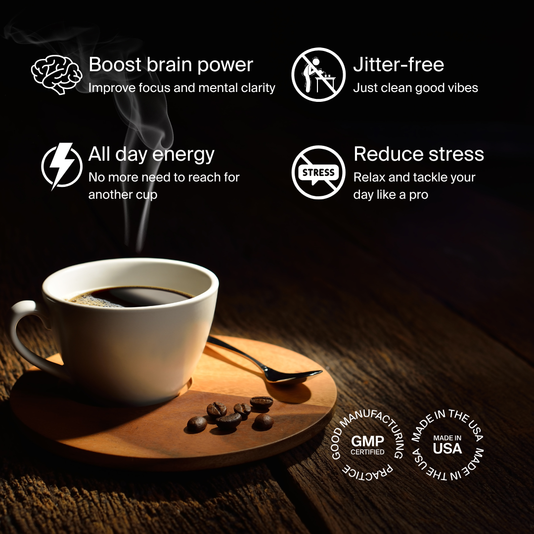 L-Theanine is a naturally occurring amino acid known for promoting relaxation and focus. When combined with caffeine, it enhances cognitive performance by improving attention and reaction times while reducing the anxiety that can come with caffeine consumption. This perfect balance creates a calm, alert state to help you power through your day​. Our blend combines 250mg of L-Theanine to perfectly balance our caffeine content, enhancing the coffee without the jitters.