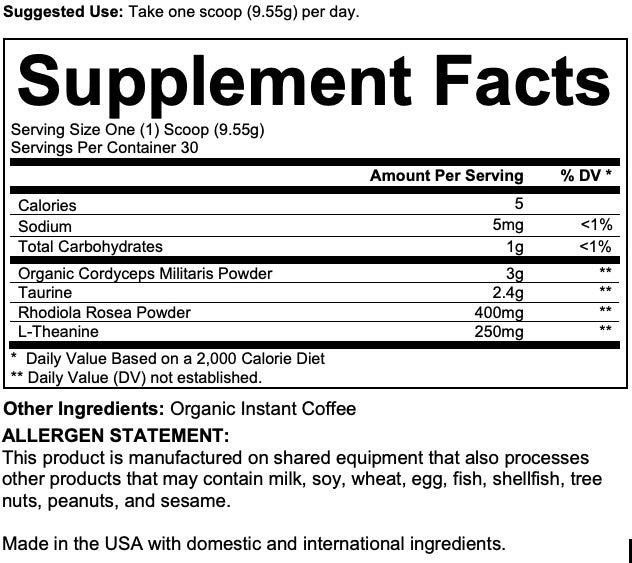 Known for its powerful adaptogenic properties, Cordyceps Militaris enhances physical performance, boosts endurance, and supports immune health. Sourced from organic fruiting bodies, Cordyceps has been shown to improve oxygen uptake (VO2) and increase stamina, making it an ideal addition to your coffee for both mental and physical resilience​. We provide a fullclinical-grade dose at 3000mg, no pixie dusting here.Â